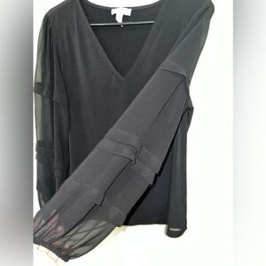 This is a long sleeve v neck ladies blouse never worn. The sleeves are sheer with a textured design. This blouse is lightweight and great for summer. Can be dressed up with slacks or down with jeans.