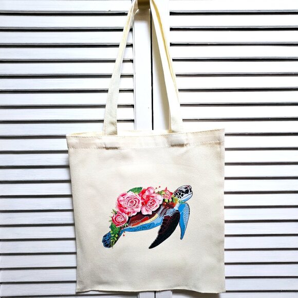 NWOT CANVAS TOTE BAG, GROCERY BAG, GIFT BAG, FLORAL SEA TURTLE 12" X 14"