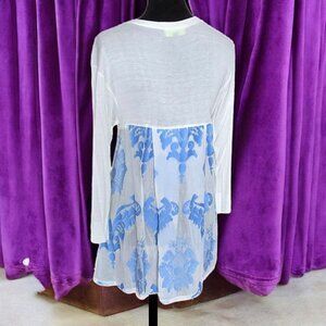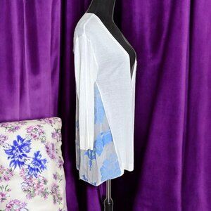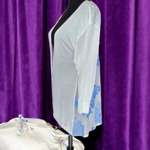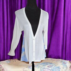 New, never worn, no tags lightweight sweater. Button up white front with white upper back and lower silk/cotton blend sewn in floral/fleur-de-lis pleated detail.