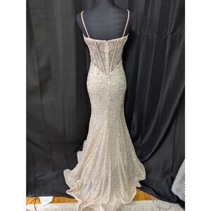 Unbelievably stunning gown,address, from CHANDALIER, Los Angeles! In champagne palest pink and beige, this dress is entirely covered in magnificent beadwork and sequinning on fine net over stretch nude! With a corset bodice, beaded straps, and a skirt that falls to a flared pool, this dress is definitely mermaid inspired! Built in bra with grippie strips, back zipper! A hundred times better than the photos! It's ultra glam and ultra Hollywood! Size 000, (would fit 00 easily, as it's stretch!) Detailed in every way, this dress retailed at nearly $1000.00, and is brand new but not tagged! ***NEW Without Tags, and Guaranteed Superb by Lily @HauteClub!*