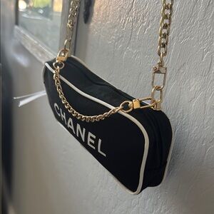 This CHANEL mini bag showcases a chic black and white design on both sides, featuring luxurious gold unbranded chain straps. Its compact size makes it perfect for carrying essentials while maintaining an elegant and timeless look. Crossbody bag. All new materials. Bag is Chanel and it has an added upcycle ♻️ unbranded high quality gold crossbody chain strap. A fun little bag for any occasion ladies!!