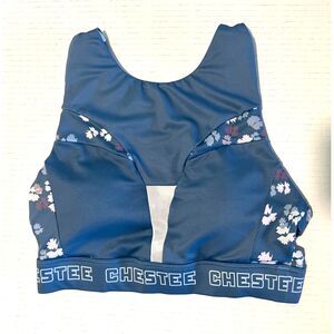 NWOT CHESTEE Blue Floral Full Coverage Lifting Crossfit Sports Bra, with protection in collarbone area for weightlifting like front squats and cleans.