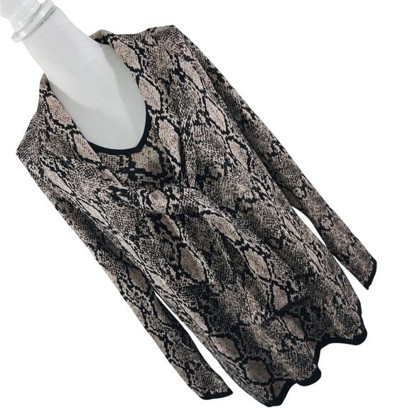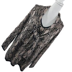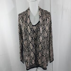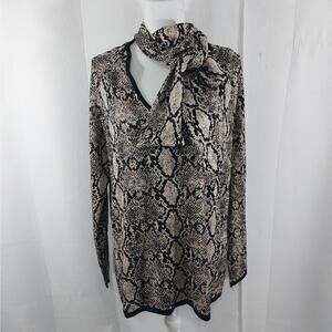 From Chico's comes this amazing sweater, in a black and gold metallic snakeskin pattern! Truly elegant, and so very vogue! BLACK trimmed neckline, wrists and waist, and a button on, removable "necktie" to do in a bow, a long crossed style, or without! A gorgeous tunic style sweater! Size L, (Chico's Size 3), bought and never worn! ***NEW Without Tags, and Guaranteed Superb by Lily @HauteClub!* Offers welcomed! 1 Day Shipping!***