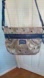 Exterior beige, colored dots, blue leather detailing, silver toned hardware, exterior slip pocket, zippered main compartment closure.