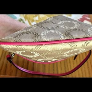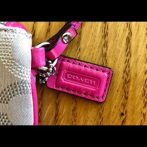 ⭐️NWOT! COACH DOT OP ART SMALL WRISTLET 😍COACH WRISTLET C EMBELLISHED KHAKI SATIN W PINK LEATHER TRIM. NEVER USED. CARE CARD INCLUDED 💌 DOT OP ART SMALL WRISTLET NWOT.