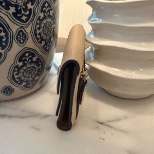 • Gold-tone exterior hardware, 1 zip coin pocket & logo