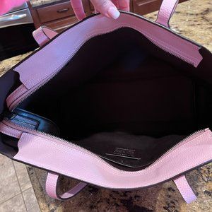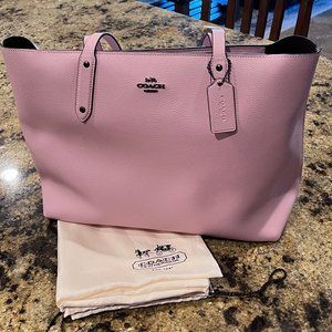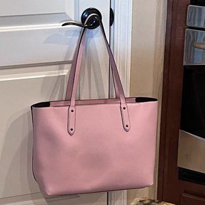 This beautiful petal pink Coach Town Tote has never been carried! It is unusual in the fact that it has black metal hardware rather than gold or silver (please see photos). It is in excellent condition. The size is 17 inches in width and 11 inches in height. It has one large compartment with a pocket that has a snap closure.