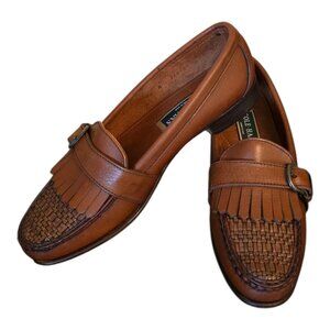 This classic leather loafer by COLE HAAN features a fringe kiltie and buckle detailing along with a woven toe box and a cushioned foot bed. This shoe is a true blend of the timeless silhouette that COLE HAAN is known for and the modern comfort we all desire. Excellent new condition. No box. No tags. Size 9N.