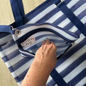 Chic CROWN & IVY navy striped tote with BONUS matching pouch. Ideal for daily essentials