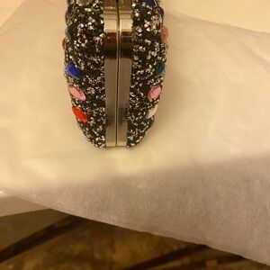 Absolutely beautiful evening bag. Adorned with multicolored crystals and sparkles. Clasp closure. Clasp is faux pearl surrounded in rhinestones. Bag is pretty large, can fit an iPhone.