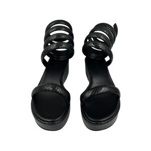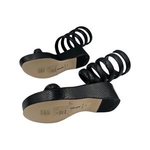 Gabi spiral strap sandals from CULT GAIA featuring black, leather, calf leather, snakeskin effect, ankle strap, wraparound style, open toe, round toe and flatform sole.