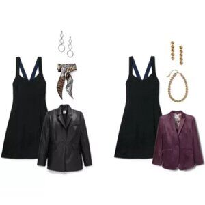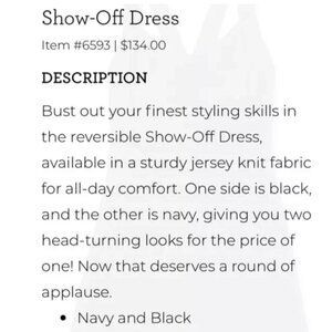 Reversible cocktail dress/Wear a black or wear a blue depending on your mood and occassion. Fits true to size with nice stretch. Style it with a blouse or jacket. Very versatile and stylish.