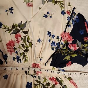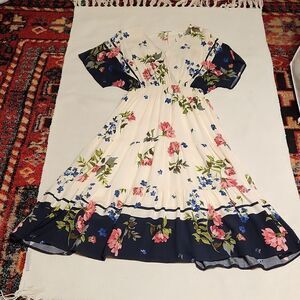 NWOT, Calista navy/ivory floral border surplus tiered midi dress
