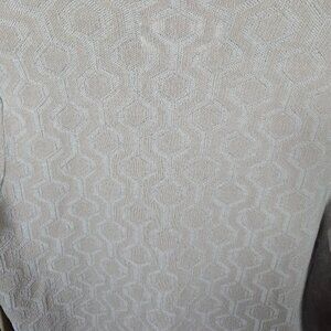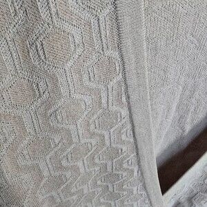 Calvin Klein beige, long-sleeved cardigan sweater with geometric knit pattern. It is made of a knit fabric and features a V-neckline and a single button closure. These cardigans are versatile and can be dressed up or down, making them suitable for both casual and more formal occasions.