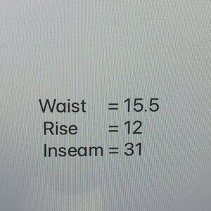 Waist = 15.5 inches, Rise = 12 inches, Inseam = 31 inches