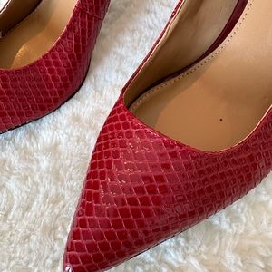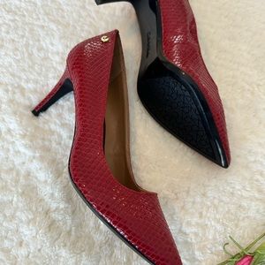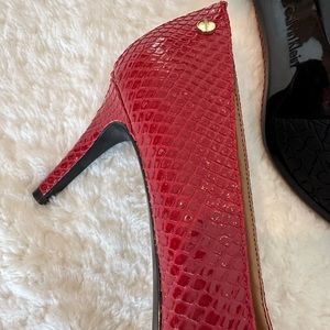 NWOT Calvin Klein Brand new red 👠 heels. Never worn! Gorgeous patterned red 3 inch heels with gold Calvin Klein insignia.