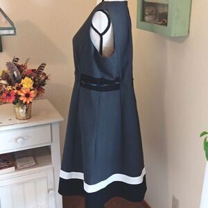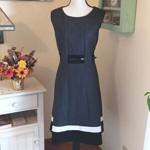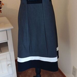 NEW. This fit and flare dress has blocks of black. The hem is trimmed with white and black. Fully lined. Back zip. Belted. Size 14 measures 43 at chest, 36 at waist, 48 at hips. 39.5 long from shoulder to hem. A classic look with a twist.