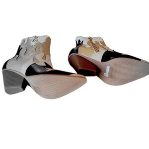 The DUMPA Black Booties by Cape Robbin feature a sleek pointy toe design accentuated by striking metal details, offering a modern and edgy aesthetic. These ankle booties are equipped with a convenient zipper closure for easy wear, while the color block pattern adds a unique flair. Crafted from high-quality PU metallic material, these booties are both stylish and durable, making them a perfect addition to any fashion-forward wardrobe. Perfect for line dancing on your Boot Scootin' Days