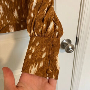 Women’s Cara Santana Apt. 9 blouse. Top is long sleeve with high neck cut. Buttons at the base of the neck. Colored a medium caramel brown & cream. Size small. Smoke free home!