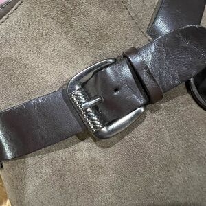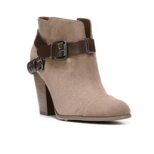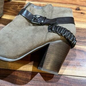 Western inspired design with adjustable side strap, zips on the interior ankle, round cap toe, 3.5” stacked block heel. Faux suede, and faux leather upper.