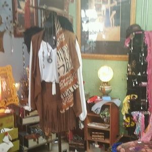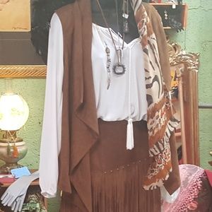 Brown vegan suede slouchy vest, hangs open, has great movement. Perfect condition. It hangs about mud hop and has plenty of room. Check out my reviews so you know what you are getting for your money. I stand behind everything I sell and I want you to be really happy when you shop with me. I still have one if these skirts in a size L,