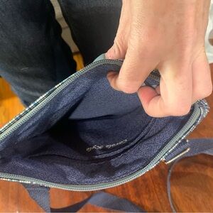NWOT Carole Kyle purse. Long adjustable strap. Large outer pocket in the front and circle inner pockets with a zipper enclosure. Fabric material. Perfect condition! 9 1/2 inches wide and 11 1/2 inches long.