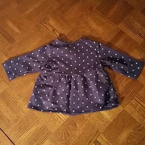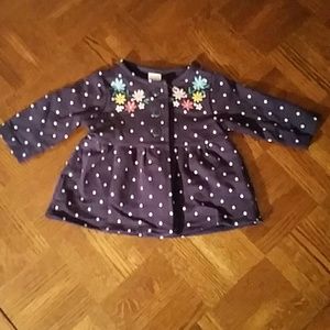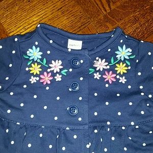New without tags...from Carter's. Size 3 months. 100% cotton. Navy with white polka dots all over. Has flower design on front. Three button closure with open bottom. Second pic shows true blue color.