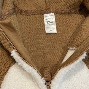 These Carter's jumpsuits are designed for ultimate comfort and warmth, featuring a soft, plush material in a charming tan and white color scheme. The long sleeves and hood add an extra layer of coziness, making them perfect for keeping snug during cooler days. With their delightful teddy bear-like texture, these jumpsuits are both practical and adorable.
