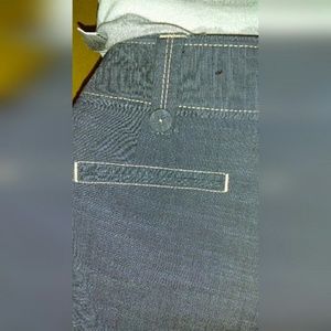 These Capri's are a blue grey tone with a contrasting cream coloredstitch that makes them stand out. If you look at picture 3 the belt loops have a matching fabric button on them. They have never been worn still have the back pockets stitched shut. The closure is zipper, hook and eyes, as well as an inside button. Inseam is20" and the waist lying flat is 16". Would look great with some flats for work or even dressed up with some heels and nice jewelry. Capri's not allowed in work dress code.??