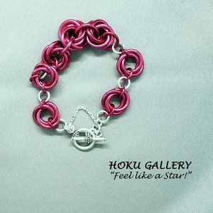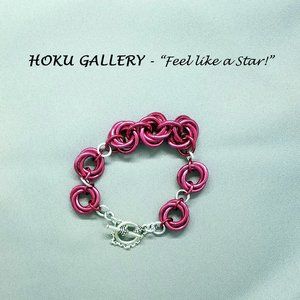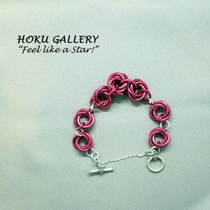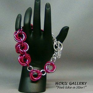 It is a very Bold Bracelet!! I made it with 12ga Anodized Aluminum rings in a Rose Color, using the Mobius Chainmaille design. I spaced each Mobius with 16ga Shiny Aluminum Rings, as well as for connection to the toggle clasp. The Toggle Clasp is TierraCast Antique Silver. To complete the bracelet, I added a Sterling Silver Diamond Cut Rollo Chain, as a Safety Chain.