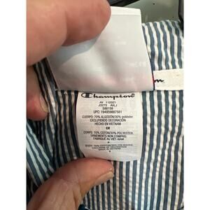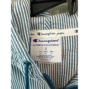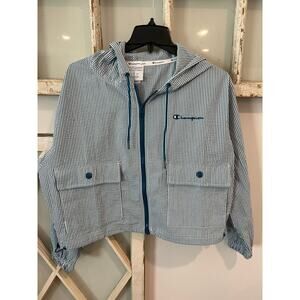 New without tags Champion size small blue & white striped seersucker jacket that zips up the front and has a hood. Measures 24 1/2” from armpit to armpit and 20” long.