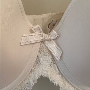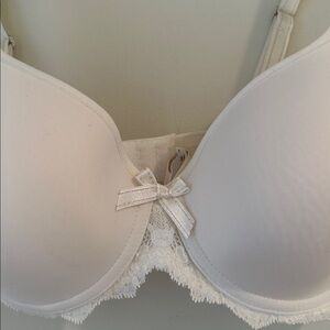 Chantelle bra with soft cream fabric. Features elegant lace accents. Ideal for daily comfort.