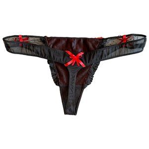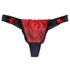 Bought because it was so gorgeous and matched the bra but I don't like thongs and never wore! Tricked myself again! Such beautiful details - black lace framing the front, the red bows & ribbons, the two black fabric-covered buttons.