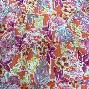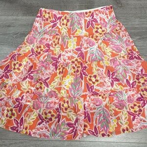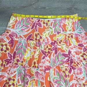 NWOT Chaps Coral Pink Yellow Floral Lined Tiered Skirt in size MP. Excellent new condition. Elastic pull on waistband, fully lined, polyester chiffon, tiered full skirt. Please see photos for approximate measurements and details. Item may show difference in color based upon photography and perception. Photos are part of the description, as everyone’s level of condition may vary. From smoke free and pet free home. All packages are shipped the same or next business day.