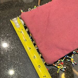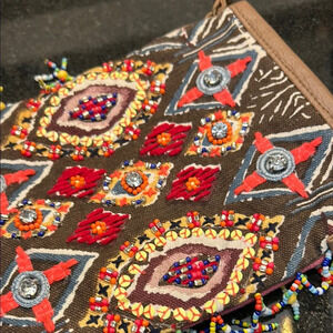 This striking crossbody bag by Charlie Paige features a bold geometric pattern in vibrant red and orange hues. Adorned with decorative tassels and bead accents, it offers a unique bohemian flair. Perfect for adding a pop of color to any outfit, this bag is both stylish and functional.