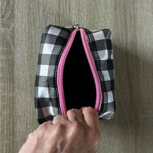 Stylish and practical, this checkered black and white cosmetic / makeup bag features a vibrant pink zipper. Perfect for organizing your beauty essentials on the go 💕😍💕