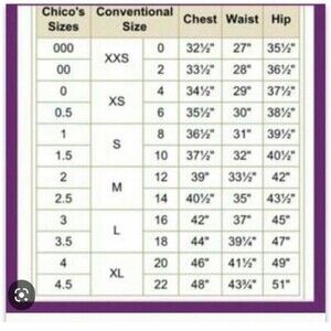 MEASUREMENTS (Flat Lay Approximate):  Pit to Pit:  23",  Sleeve:  22.5", Length: 24"..  Chico's Size 2 = Size 12/14 - see size chart picture.