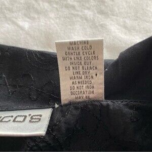 NWOT.  Beautiful Chico's (Chico's Size 2) Top Blouse Jacket. Black with subtle black embroidered stitching in paisley, floral abstract pattern on front & back.  Large black buttons adorn the front.  Buttons on side hemline to make fit tighter or looser.  Collared. Lightweight and luxurious fabric.  Has vintage, retro, victorian, feminine, prairie, and sexy vibes.