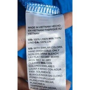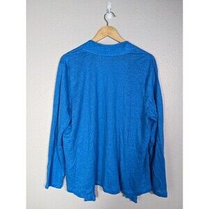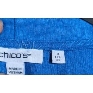 This is a Chico's linen cardigan in size XL for women, featuring a V-neckline, open front, long sleeves, and a solid blue color. The cardigan has a bohemian and classic style with colorful accents, suitable for travel and casual occasions in any season. It is brand new without tags.