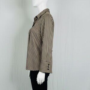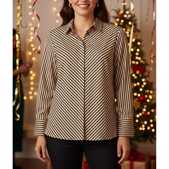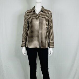 Chic and polished! This Chico’s No Iron button-up shirt features a silky sateen finish in brown and black diagonal stripes for a bold, modern look. Designed with a structured collar, button cuffs, and wrinkle-free fabric for effortless wear and care.