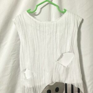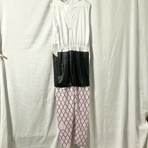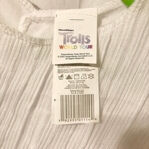 Officially Licensed DreamWorks Trolls World Tour Barb Halloween costume from Target. Size girl's M (7-8). Includes jumpsuit with attached belt and headpiece with ears and mohawk. Top of jumpsuit is dual-layered; the top layer is distressed and ribbed; bottom of jumpsuit is shorts made to look like faux leather and distressed fishnet stockings. "Belt" is printed on the jumpsuit and has a skull at the center. Headpiece has a red mohawk and troll ears with piercings attached. Costume has Velcro closures at back. Made of polyester, exclusive of decorations.