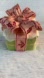 It is a lime green cake four petite square with yellow icing around the middle with a pink and red holly ribbon bow and white glitter icing on top. There is a round hook on top for hanging.