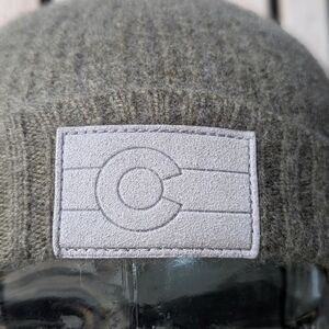 New without tags sage green ribbed knit Colorado beanie toque hat from Cirque Mountain. Designed in Vail, Colorado USA. Super soft 80% cashmere 20% fleece wool. Light gray microsuede Colorado flag patch on front. Cuffed. Unisex. No flaws.