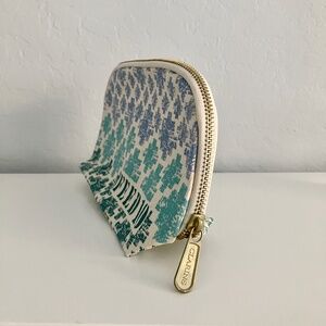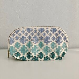 NWOT Clarins Feed 10 Limited Edition Canvas Makeup Cosmetics Bag / Pouch. Blue, teal and cream geometric pattern.