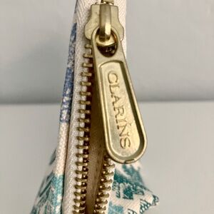 NWOT Clarins Feed 10 Canvas Makeup Cosmetics Bag Pouch Blue and Cream