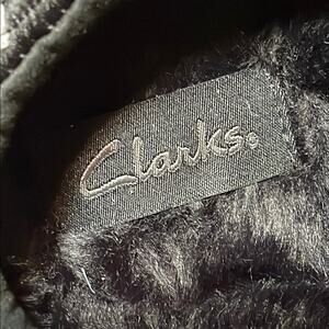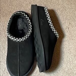 NWOT. Clarks Black Faux Fur Lined Slippers with White Contrasting Stitching. 10