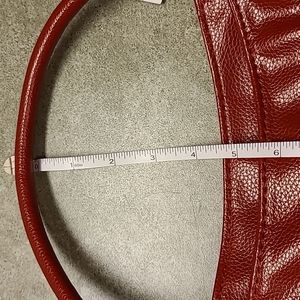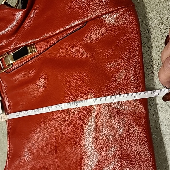 NWOT Closet Ritual Handbag, red. Has top zip close and exterior zip pocket. The handles are accented by gold and black ornate fixtures (back has gold only). There is a interior center zip, kangaroo pockets, and a zippered pocket. Comes with shoulder strap and dust bag. All measurements are made. Smoke free home.