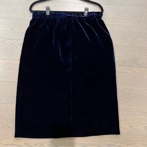 Never worn before skirt. Skirt is pencil length and has an elastic waistband with black ribbon drawstring with front slit. Has minor defect from trying on in the slit as photographed. Fabric is a beautiful deep blue velvet skirt. Skirt is lined.