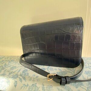 Never used, brand new midnight Blue crocodile-embossed crossbody Coach bag. Buckled closure with burgundy suede lining. Two compartment inside with a inside sip pocket. Outside pocket on the back. Adjustable strap.