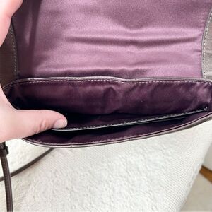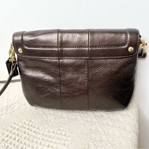 2012 Era Kristin Metallic Leather Crossbody Bag by Coach. Style No. 45128 in B4/Bronze, a gorgeous chocolate brown with a metallic sheen. A timeless classic silhouette, this small purse has Y2K and minimalist vibes. Perfect neutral designer bag for a woman the go. Iconic Kristin clip flap closure. Burgundy lined interior features a six card slot built-in wallet and one slip pocket. Brass/gold tone hardware. Strap detaches for hand carry or use as a large pouch. Measures 8.5"x6"x1.25" with a 22" strap drop. Hang tag included.